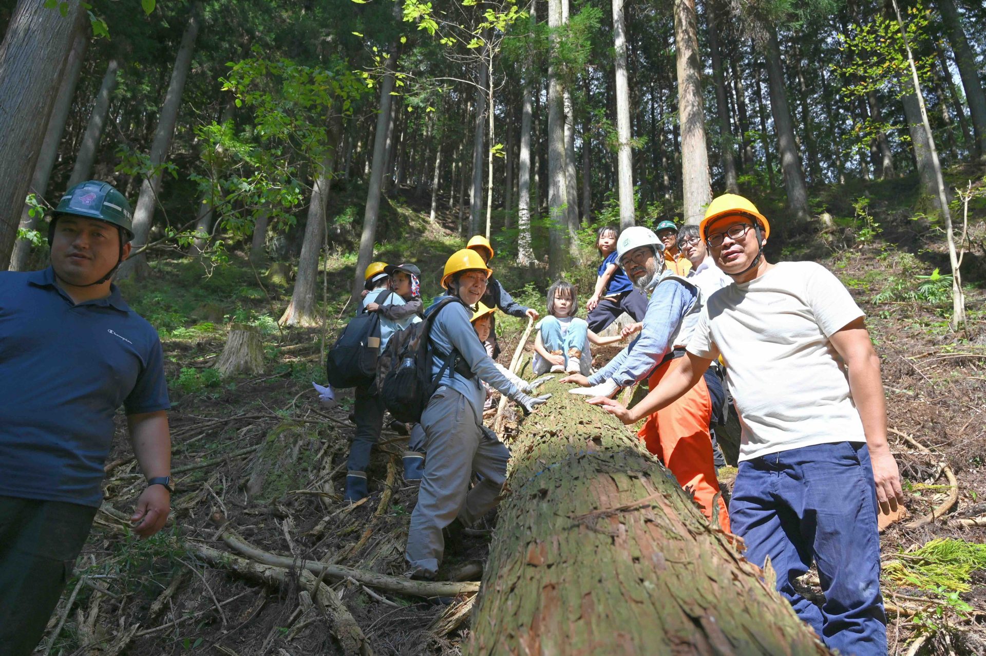 最後に記念撮影である。今回はスタッフも皆、自分たちのお子様と一緒に体験した。田部井君も松原さんも良い家族サービスができたと思う。小さなお子様にとって、実際の山で木を伐るなど本当に貴重な体験だろう。協力者の皆様に心より感謝したい。