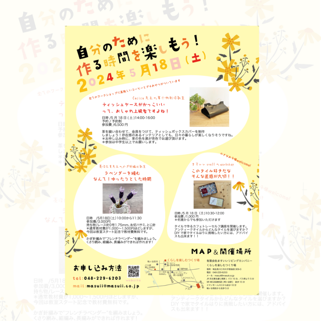 5月18日(土 )には、3つの教室を同日に開催します!(お教室は事前予約制ですが、モデルハウス見学はご予約なしでもご見学いただけます。)