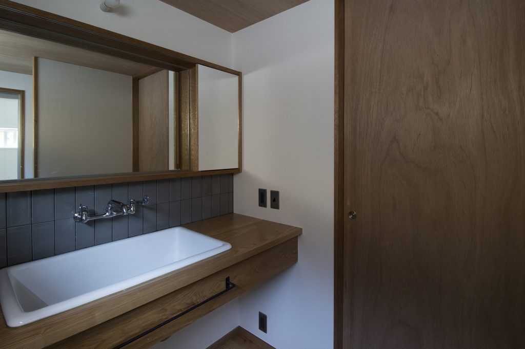 造作で作った木の洗面カウンターとタイルの相性はとても良いです