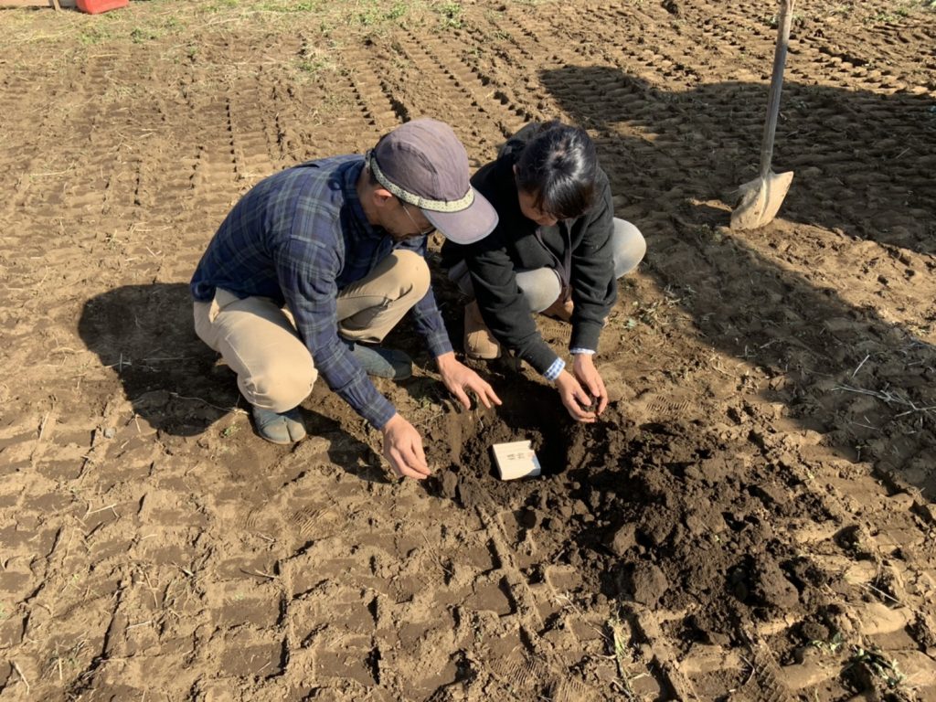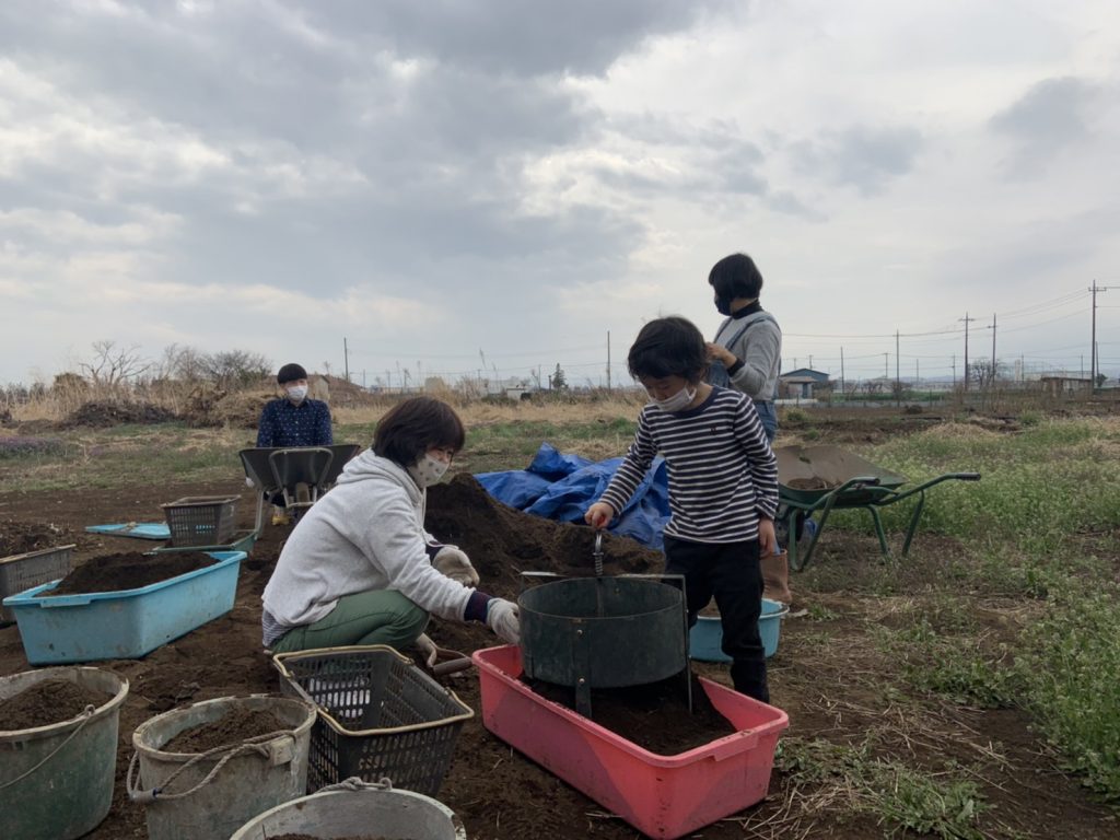 まずは畑の土をふるいにかけ余分なものを取り除きます