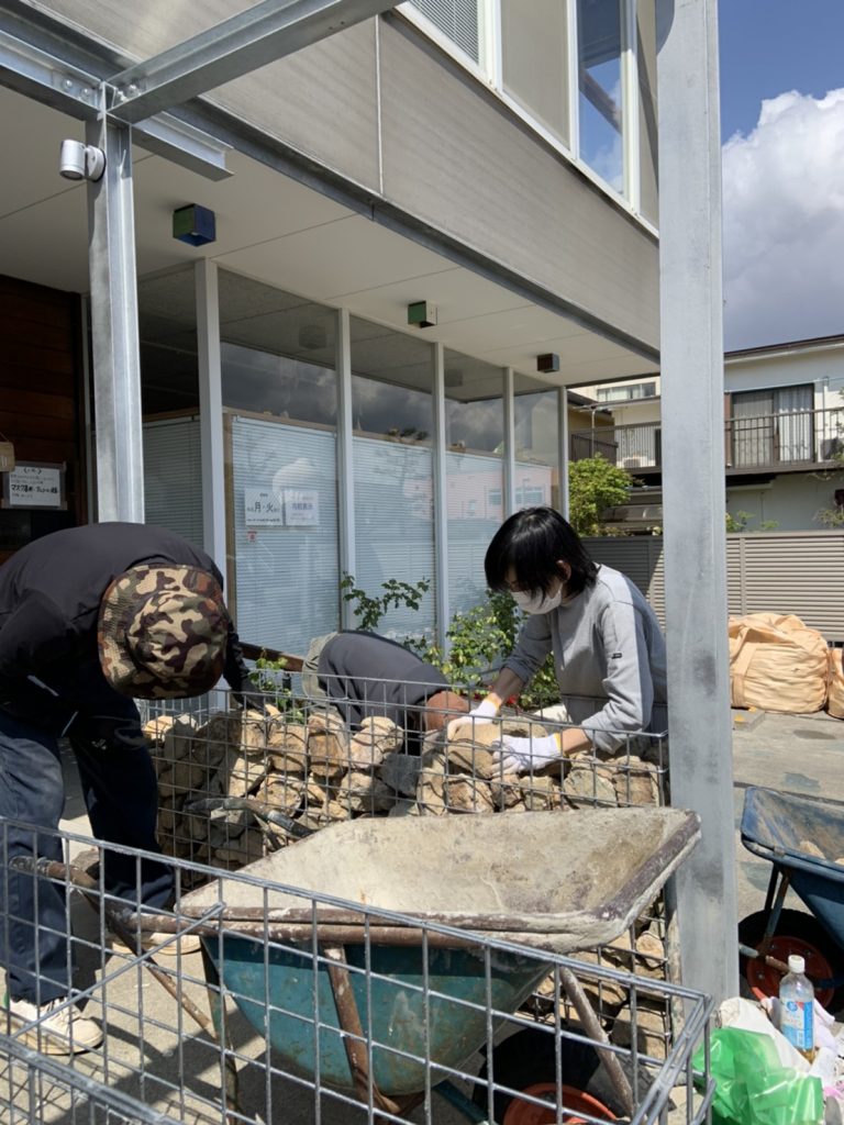 このテラスを作る際に、蛇籠に石を積むセルフビルドを行いました