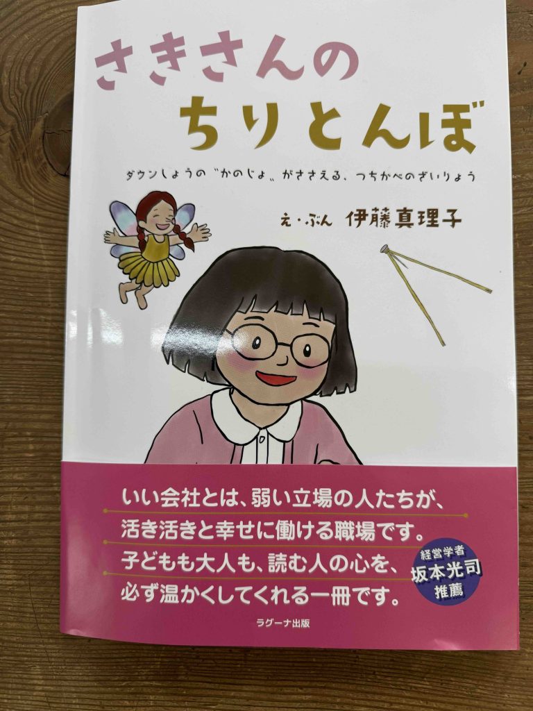 ある日、娘から、「親友の妹さんが重度のダウン症で、もしB型終了支援施設に就職しても袋詰めの作業で月給が6000円にしかならない。お父さんの会社でなんとかならないの?」という話を相談された。うちの会社は小さいから障害者雇用の義務はない。義務はないけれど、何かの形で貢献したい。そう考えてこれまでも、就労支援施設からの物品の購入などを続けていた。今回は、娘の親友の妹さんからの相談である。さてさて、ここでなんとかできなければ、僕は一生障害者雇用をすることはできないだろう。そんな思いで、何ができるかを考えた。そういえば、最近左官の伝統構法の素材の中には、作り手がいなくなって困っているものがあると聞いた。作り方はどう考えても簡単そうだ。これならさきちゃんにもできるかもしれない。試しにやってみる?の話から練習を繰り返し、ようやく商品が完成した。素材は麻紐である。麻はとても高価な材料で、まともに購入すると売値よりも高くなってしまう。どうしようかと悩み、栃木県の麻問屋「もみぢや」さんに電話をかけて訪問し、事象を説明すると、なんと無償で提供してくれるという。本当にありがたい。これならなんとかできそうだ。そして、この物語を絵本にした。それが下の写真である。