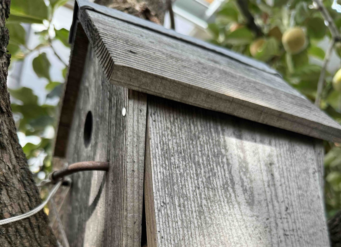 庭に植る柿の木の枝に設置してある鳥の巣に、どうやら本当に鳥が住み着いてくれたようだ。すでに巣立ってしまったのか、中に鳥の姿はないのだけれど、まるでお布団のように枝葉が敷き詰められている。この木は、毎年それなりに美味しい柿が成るので、秋になるとたくさんの鳥がやってくる。僕たちは柿がなるとそのうちいくつかは獲って食べるが、ほとんどは鳥の餌にしてあげるからである。特にムクドリはたくさんいて、毎年その愛らしい姿で楽しませてくれる。餌をあげているわけではないけれど、そんな感覚もある。都会の中の共存だろうか、殺伐とした川口市でも、やっぱり鳥の声とか、その周りで興味津々で眺める猫の姿はうるおいとなるし、そういう環境を作り上げる大切な要因に柿の木がなっているのである。