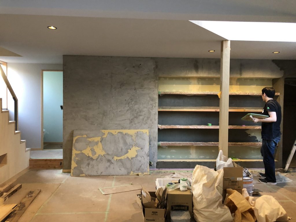 壁と壁のジョイントをつなぎ合わせて、左官仕上げを