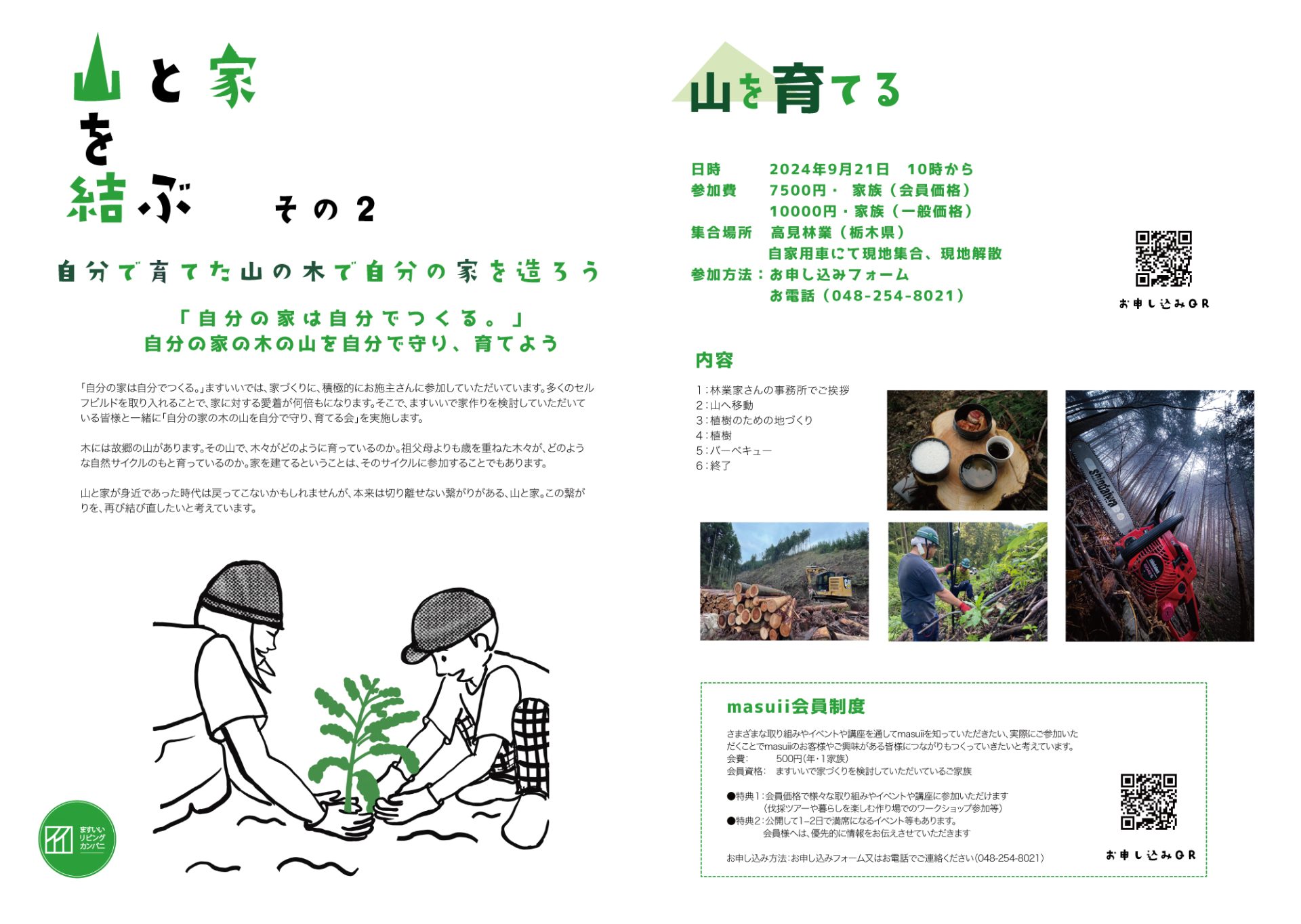 木の選定や伐採は、ますいいリビングカンパニーと高見林業と田村材木店。建築事務所と林業と製材所とが深い信頼関係で結びつくからこそできることです。実際に伐採した木材を使用するためには設計の早い段階から計画をする必要があります。ますいいの建築士と相談しながら、木の選定や伐採からはじまる家づくりをしましょう。