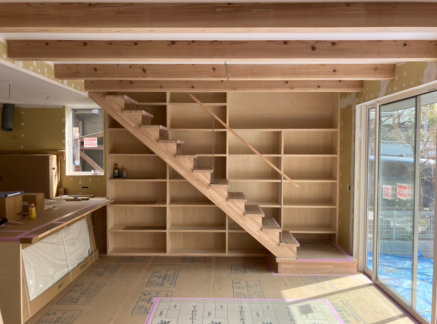 階段沿いに、リビングから2階へと続く吹き抜け部分に、大きな本棚を設置。