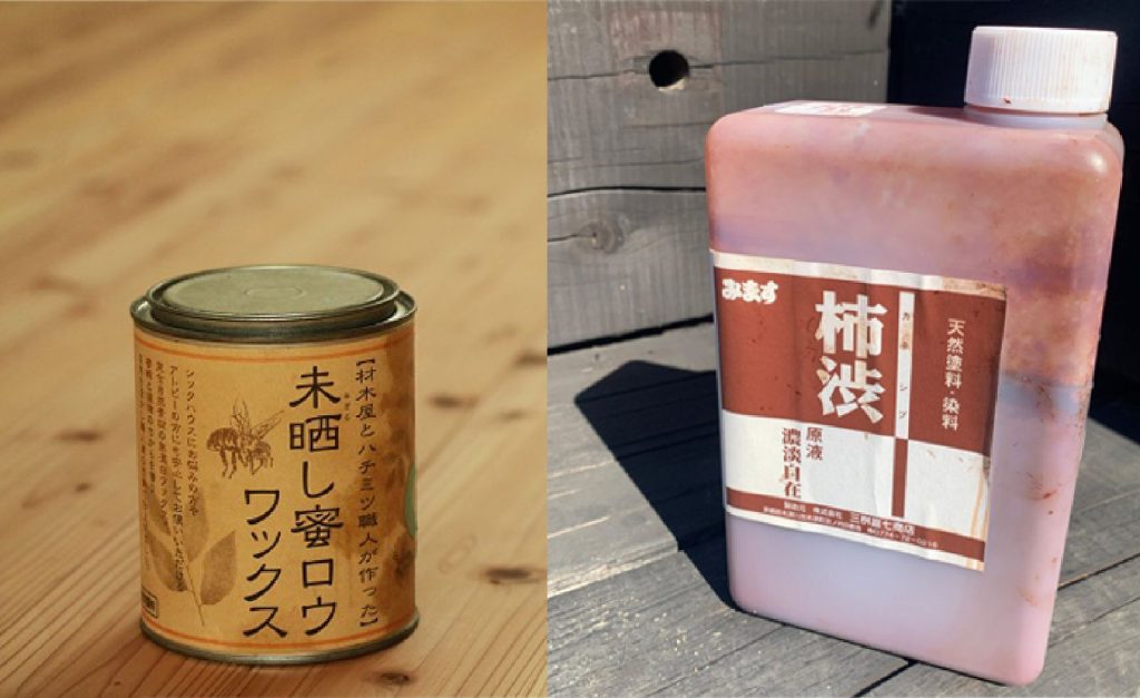 柿渋(かきしぶ)は、渋柿の青い未熟果を潰し、圧搾してできる液体を発酵させて作られており、壁をラワン合板や、シナ合板で仕上げる時に使うことをおすすめしています。