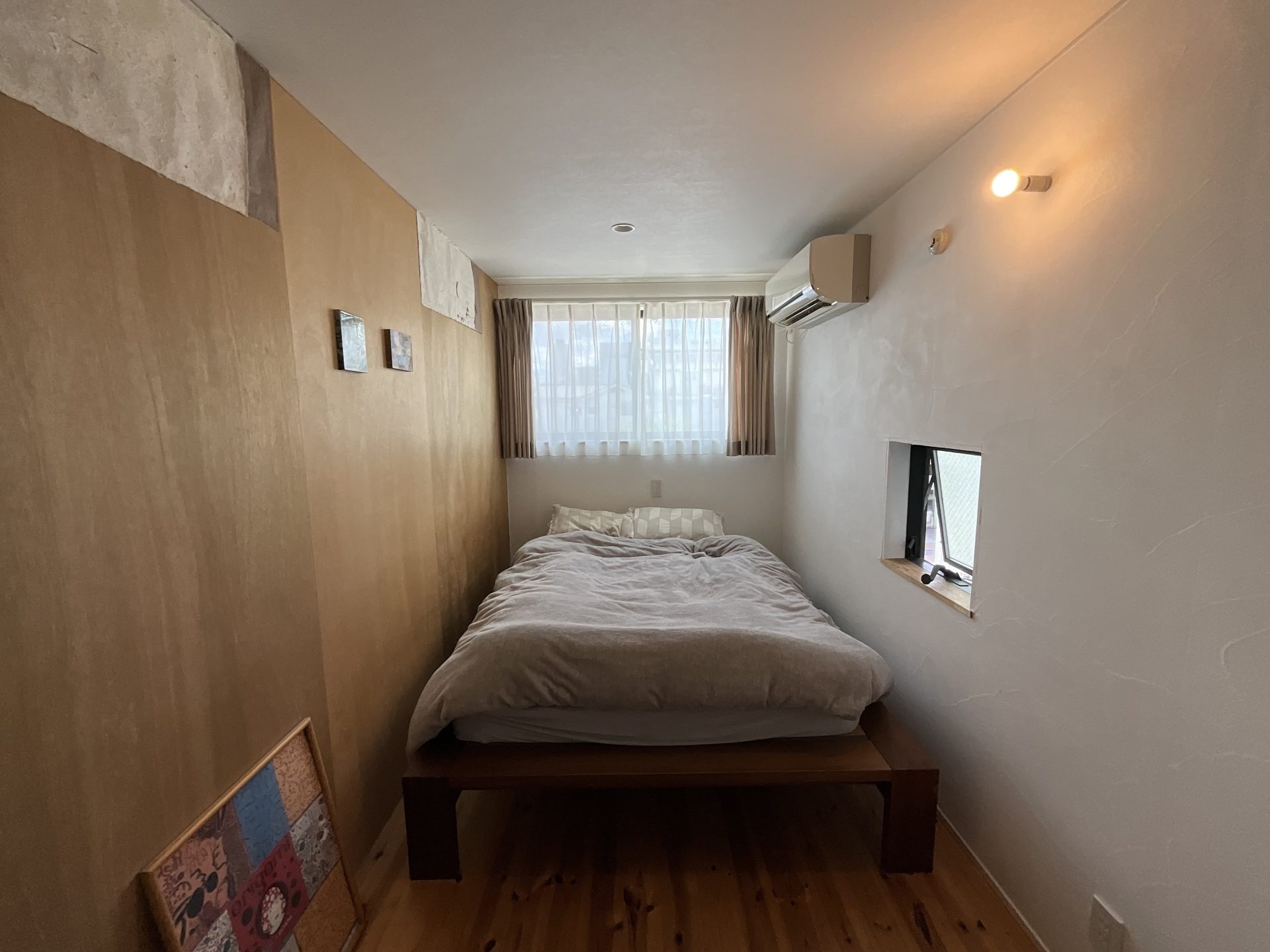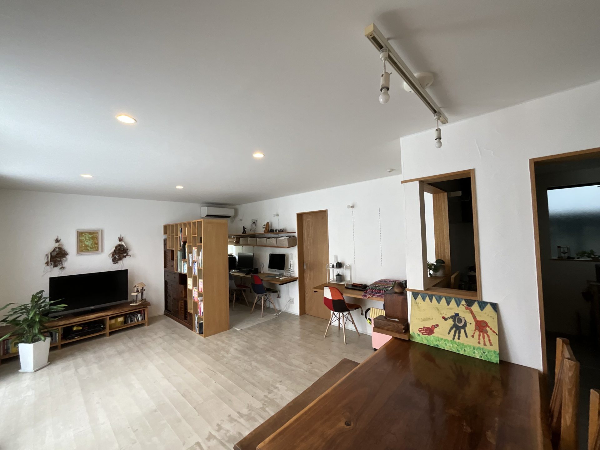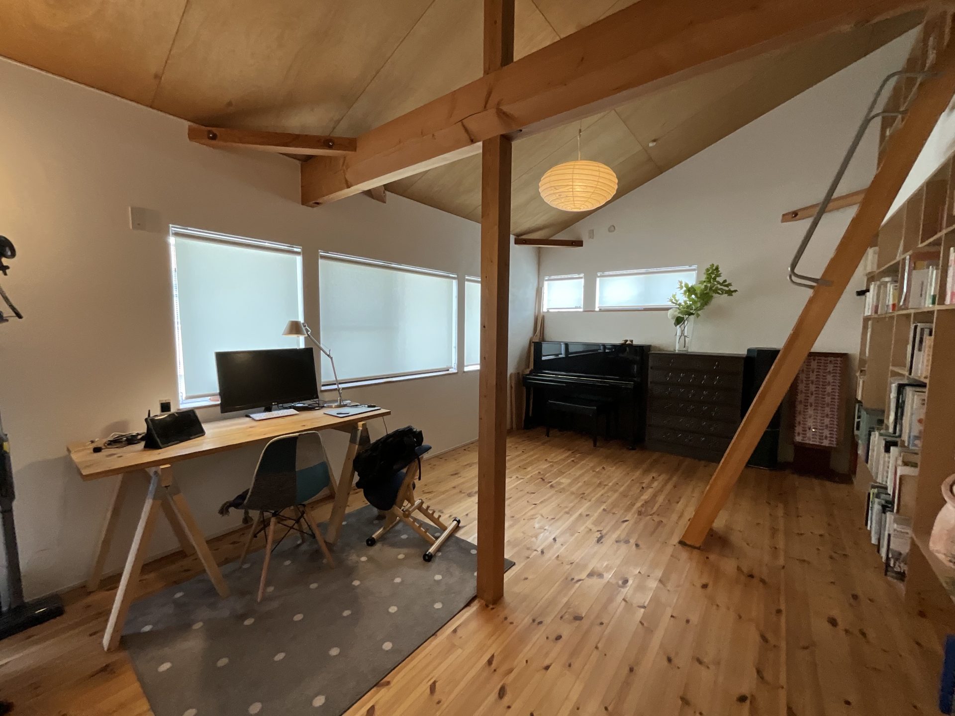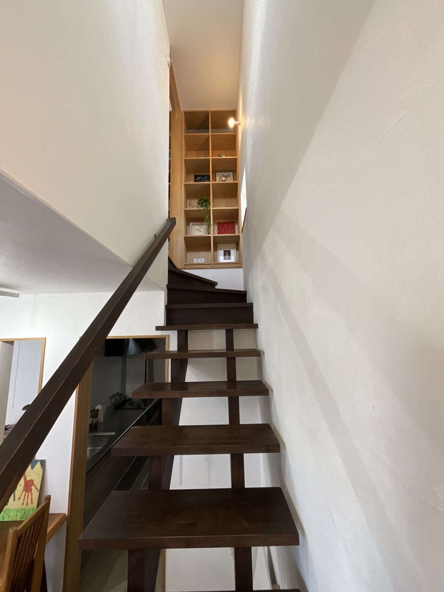 町工場が建ち並ぶ川口に、様々なシーンを棚が彩る本棚の家が出来ました。 外観は左官で仕上がった正面部分をガルバリウム鋼板の黒い外壁・屋根が覆う形になっています。 内部はラワン材で造作した家具が至るところに配置されています。 以前からお持ちだった階段収納とその上に乗っかるようにして作られた段々家具が、リビングとPCスペースを仕切っています。 床のパインはお施主さんがグレーに塗装したことにより、特徴的な家具たちがさらに浮き上がってきます。 2階は寝室と共有スペースを区切る壁一面のグリット棚がロフト部分までのびて、棚上部に開口を設けることで寝室に柔らかい光を注いでくれています。 これからお子さんの成長や生活の変化に合わせて棚に置かれるものが変わっていき、建築全体の表情が変わっていくそんな風景が楽しみなお家になりました。